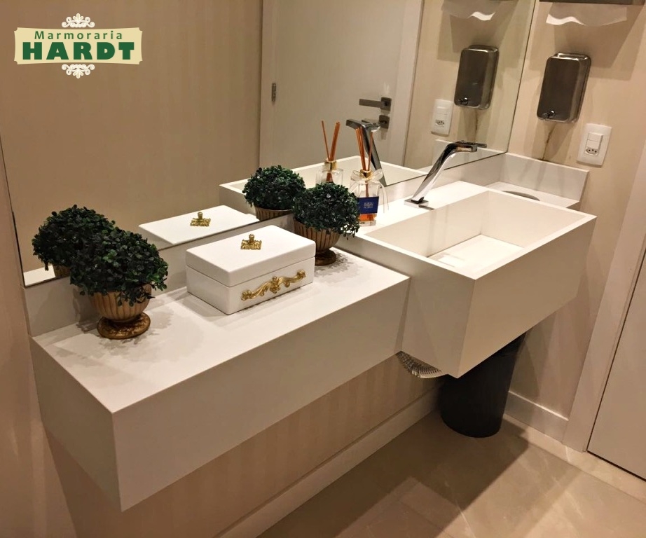 Com cuba esculpida na própria pedra, em Compacto de Quartzo Branco.